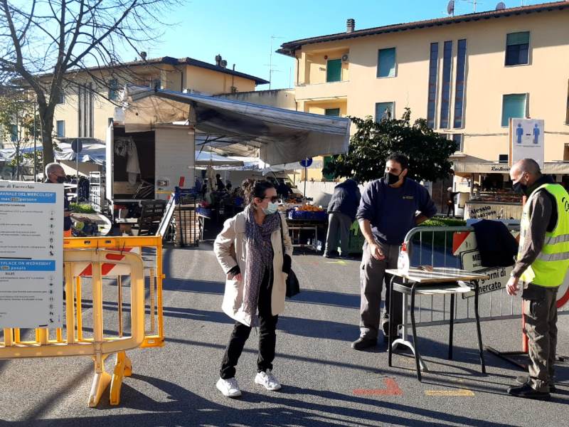 Tre varchi distinti, controlli sul numero di accessi col conta-persone, misurazione della febbre e utilizzo di gel sanificante. Sono state queste le linee guida che a Fucecchio hanno accompagnato il primo mercato settimanale da quando la Toscana è entrata in zona rossa. Un mercato che questa mattina si è svolto dunque nel pieno rispetto della normativa vigente sebbene in forma ridotta, ossia con i banchi dei soli generi alimentari, gli unici consentiti dall'ultimo DPCM nelle regioni rosse. Fondamentali, per garantire la massima sicurezza, sono stati il contributo della Polizia municipale e del personale del Comune e la collaborazione della Croce Rossa Italiana, presenti in piazza XX Settembre per monitorare la situazione e controllare che tutto si svolgesse secondo le disposizioni anti covid.