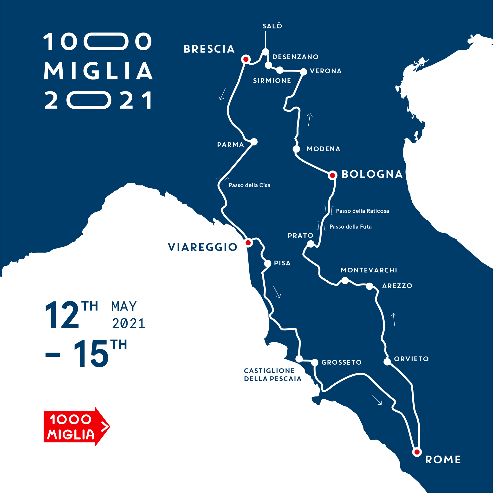 Rispettando la tradizione del tracciato da Brescia a Roma e ritorno – con arrivi di tappa a Viareggio e Bologna – l’edizione 2021 presenterà una novità assoluta per la 1000 Miglia rievocativa: per la prima volta, il senso di marcia della gara sarà invertito rispetto alle recenti edizioni, riprendendo il senso antiorario di molte edizioni della corsa originale di velocità. Da Brescia, gli equipaggi faranno rotta verso la costa Tirrenica per sostare a Viareggio, ripartendo il giorno successivo alla volta di Roma. La terza tappa, al via dalla Capitale, risalirà verso nord per concludersi oltre l’Appennino, nel capoluogo Emiliano. La quarta e ultima tappa, da Bologna condurrà fino al tradizionale arrivo a Brescia. Peculiarità che soddisferà numerosi appassionati è un tracciato inedito che porterà gli equipaggi ad affrontare per la prima volta sia il Passo della Cisa, nella prima tappa, che i Passi di Futa e Raticosa nella terza giornata di gara.