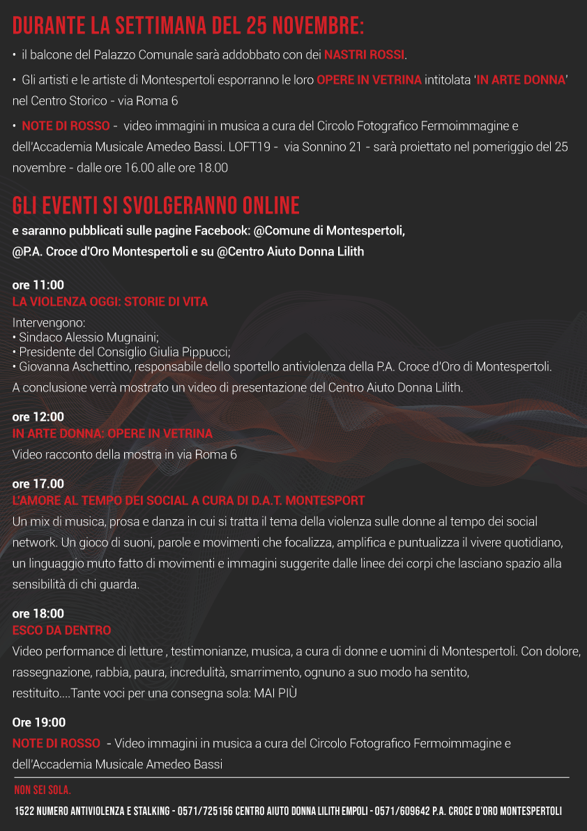 Nella settimana del 25 novembre, il Palazzo Comunale sarà illuminato di rosso e il balcone sarà addobbato con nastri e stoffe rosse. Per l’occasione, gli artisti e le artiste di Montespertoli esporranno le loro “opere in vetrina” nel Centro Storico (Via Roma, 6) con la mostra "In arte Donna". Il 25 novembre, dalle 16:00 alle 18:00, "Note di Rosso" sarà proiettato il video immagini in musica a cura del Circolo Fotografico Fermoimmagine e