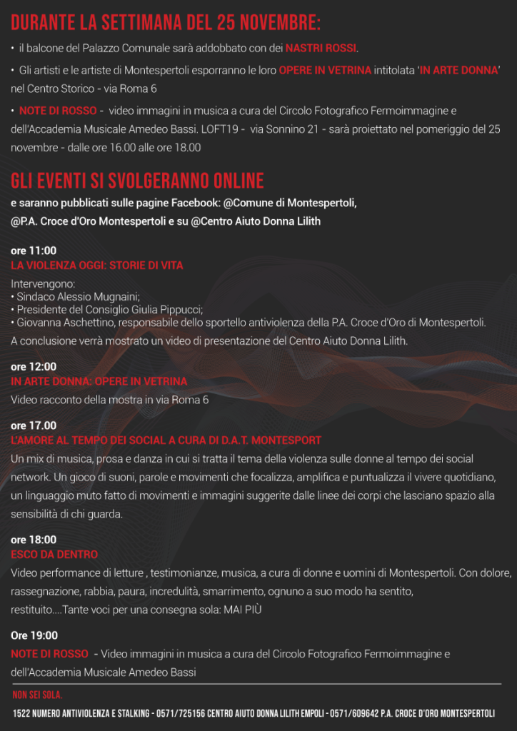 Nella settimana del 25 novembre, il Palazzo Comunale sarà illuminato di rosso e il balcone sarà addobbato con nastri e stoffe rosse. Per l’occasione, gli artisti e le artiste di Montespertoli esporranno le loro “opere in vetrina” nel Centro Storico (Via Roma, 6) con la mostra "In arte Donna". Il 25 novembre, dalle 16:00 alle 18:00, "Note di Rosso" sarà proiettato il video immagini in musica a cura del Circolo Fotografico Fermoimmagine e