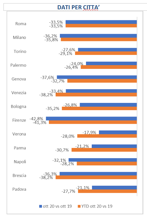 Le rilevazioni delle regioni non riflettono i dati delle città, dove Firenze si riprende lo scettro di peggiore con -42,8% e -41% nel progressivo anno, seguita da Genova con 37,6%. Brescia -36,3% e Milano -36,2% mostrano andamenti similari. Le città d’arte perdono qualche punto percentuale in meno rispetto alle città a vocazione ‘industriale’ lombarde e liguri: Roma chiude a -33,5%, Venezia a -33,4%, Napoli -32,1%, Torino -27,6%, Bologna -26,8%, Palermo -24%, Parma -21,2%, Padova -21%, Verona -17,9%.