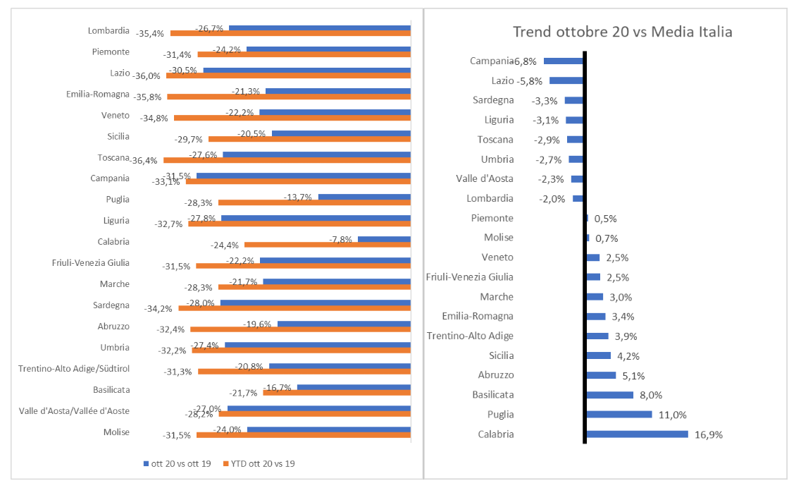Le aree geografiche flettono tutte intorno al -34%, tranne il Sud che chiude a -29,8%. A sorpresa la peggiore regione è la Campania con -31,5%, che supera Lazio -30,5%, Sardegna -28%, Liguria -27,8%, Toscana -27,6%, Lombardia -26,7%, Piemonte -24,2%, Emilia-Romagna -21,3%, Veneto e Friuli-Venezia Giulia -22,2%. Allenta la morsa il Sud, dove la Sicilia lascia sul terreno -20,5%, mentre Puglia -13,7% e Calabria -7,8% chiudono il mese meno in sofferenza.