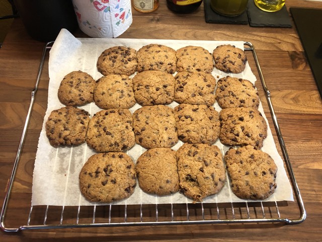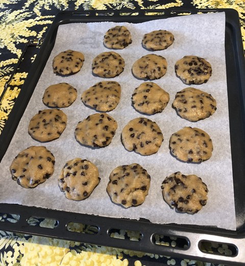 Lasciare risposare in frigo per circa 20 minuti. Poi estrarlo, formare delle palline o dischetti e disporle distanziate su una teglia con carta forno, perché cuocendosi si espandono un po’. Cuocere per 15 minuti a 190 gradi circa finché i cookies non saranno dotati. Tirarli fuori dal forno e lasciarli freddare su una griglia. Anche se inizialmente possono sembrare di consistenza molto morbida dopo qualche minuto di raffreddamento raggiungeranno la giusta consistenza.