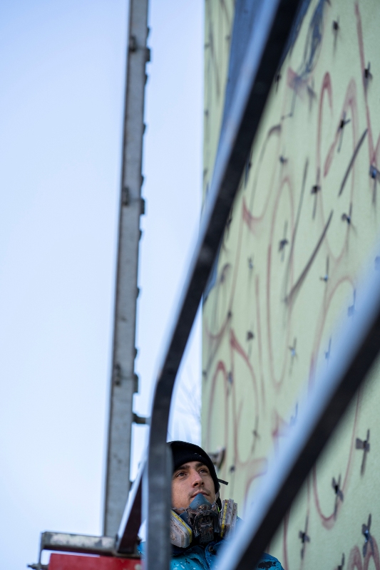 Come nel suo stile, Jorit ha iniziato la fase preliminare del murale tracciando a tutta parete una frase, in questo caso note riflessioni gramsciane tratte da “Lettere dal carcere”: “Anche quando tutto è o pare perduto, bisogna rimettersi tranquillamente all'opera, ricominciando dall'inizio… La crisi consiste appunto nel fatto che il vecchio muore e il nuovo non può nascere”. Condizioni meteo permettendo, il murale sarà completato in 10/15 giorni.
