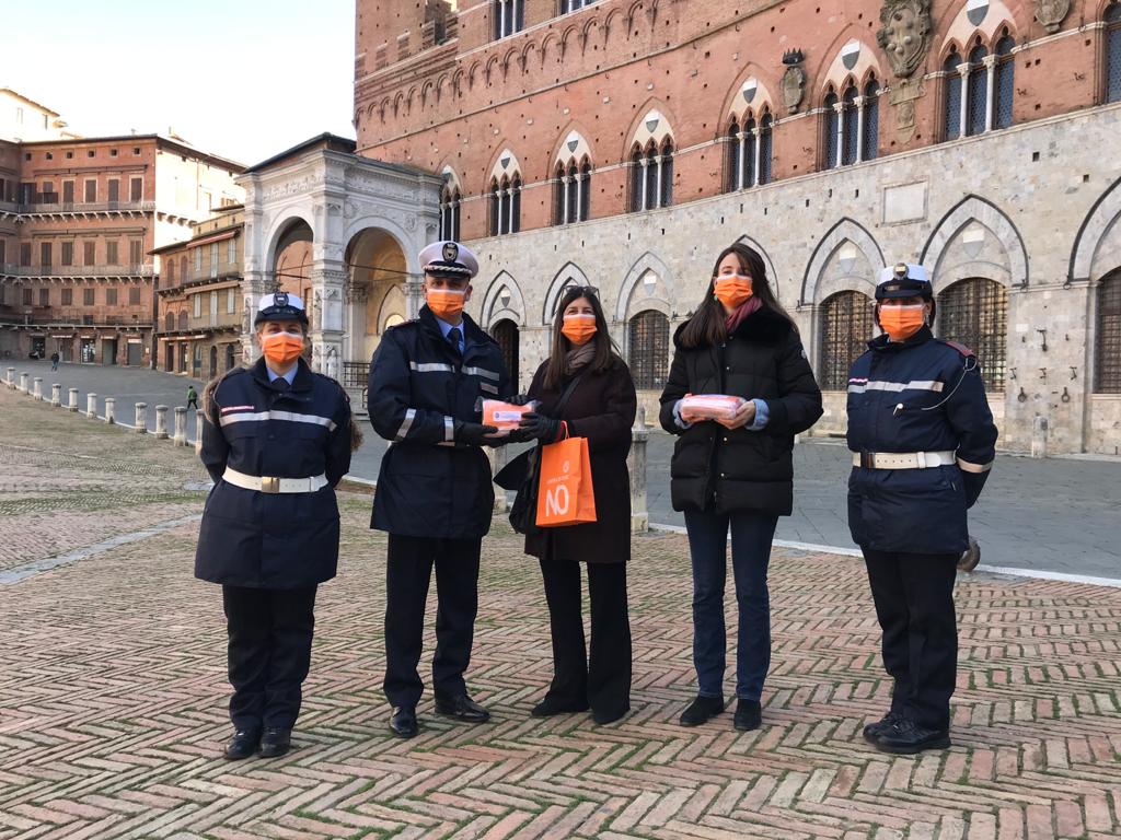 Come prima cosa, è stata effettuata una donazione di 300 mascherine di colore arancione al Comando di Polizia Municipale di Siena, che ha aderito alla iniziativa con entusiasmo tramite il Comandante Tafuro. Le mascherine verranno indossate dall’intero Corpo dei Vigili il 25 novembre ed il 10 dicembre, inoltre saranno indossate dalle Vigilesse durante i 16 giorni di attivismo. Un messaggio simbolico per richiamare l’attenzione sul fatto che il lockdown dovuto all’emergenza che stiamo vivendo colpisce più duramente alcune persone rispetto ad altre; le mascherine quindi come protezione imprescindibile contro il Covid-19 ma anche come simbolo della impossibilità per le vittime di violenza di chiedere aiuto durante la pandemia.