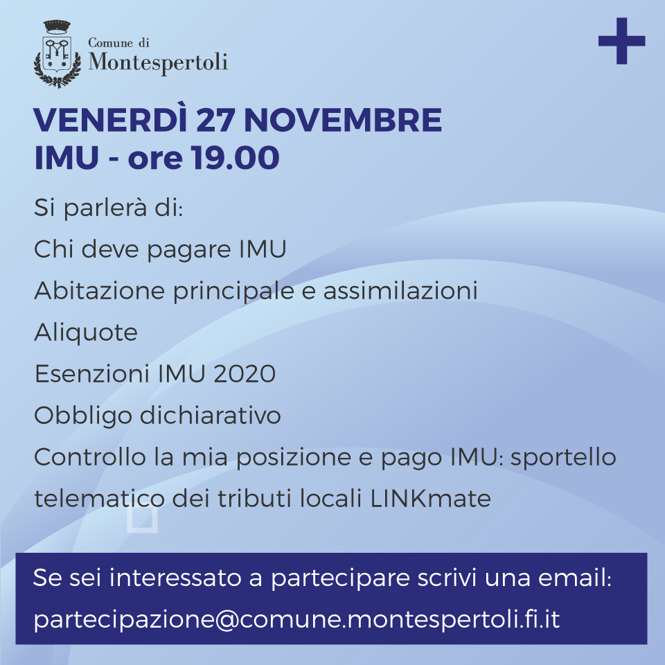Dopo il successo della scorsa settimana, per questo venerdì l'Ufficio Tributi ha organizzato un incontro per parlare di IMU, nel dettaglio sarà affrontato: