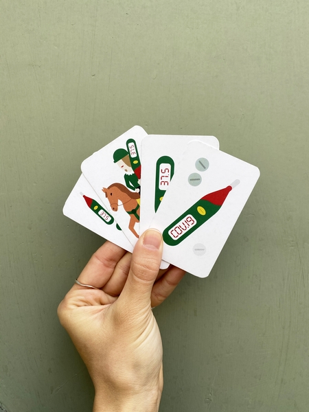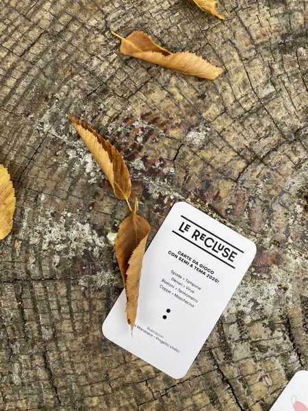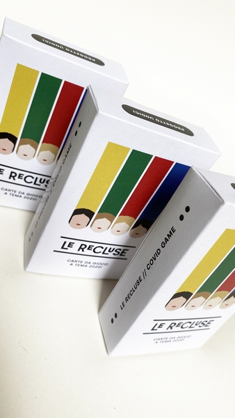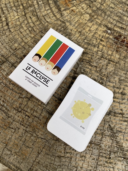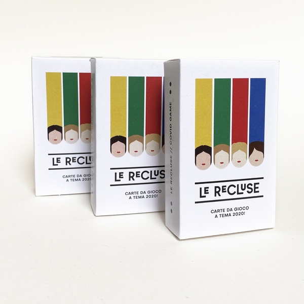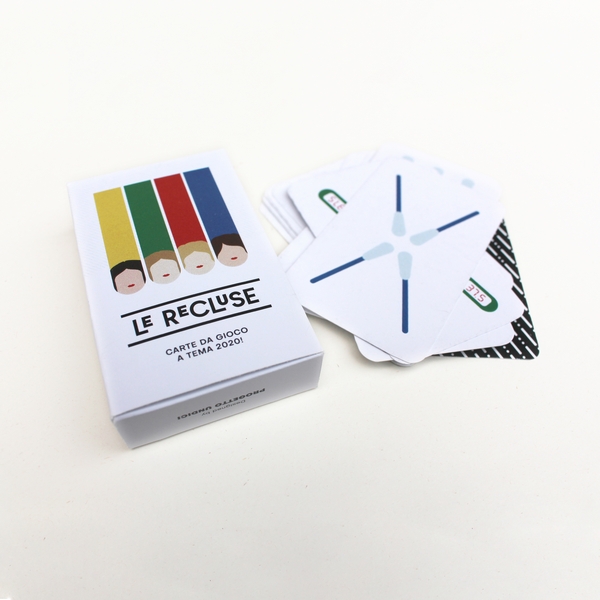 “Le recluse” sono una rivisitazione delle tradizionali carte napoletane con quattro nuovi simboli (tampone, termometro, virus e mascherina) che possono rappresentare le storie di tante altre persone risultate positive al Coronavirus. Dalla Briscola a Tresette, dalla Scopa a Rubamazzo, Le Recluse si prestano a varie interpretazioni, ideali per portare quel pizzico di fantasia anche sotto l’albero di Natale. I quattro nuovi simboli contengono il seme Tampone (Laura, è quella che ha effettuato il maggior numero di controlli, ben 6 tamponi nei suoi 42 giorni di isolamento); il seme Virus (Elda, occupava il tempo modificando gli scatti delle quattro amiche inserendo al posto degli occhi l’emoticon del virus, per strappare a tutte un sorriso); il seme Termometro (Federica, ha avuto costantemente 37.5 di febbre durante i 30 giorni di positività) e infine il seme Mascherina (Claudia, da quando è tornata in libertà, sgrida prontamente chiunque le passi davanti con la mascherina fuori posto). Carte per giocare al solitario oggi, sperando di tornare a divertirsi insieme domani.