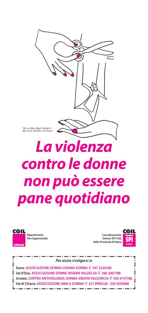 “La violenza contro le donne non può essere pane quotidiano” è il titolo dell’iniziativa che troviamo stampato sulle buste insieme al disegno realizzato dalle studentesse e dagli studenti del Liceo artistico “Duccio di Buoninsegna” e ai recapiti telefonici dei quattro centri antiviolenza operanti sul territorio della provincia di Siena.