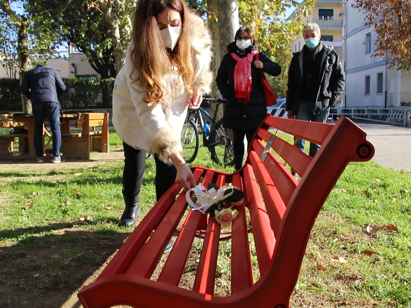 - L’inaugurazione della panchina rossa a Pontedera avvenuta l’anno scorso. Marianna Abbondanza, Rossella Prosperi, Carla Cocilova, Angela Pirri, Domenico Pandolfi, Mattia Belli (foto gonews.it)