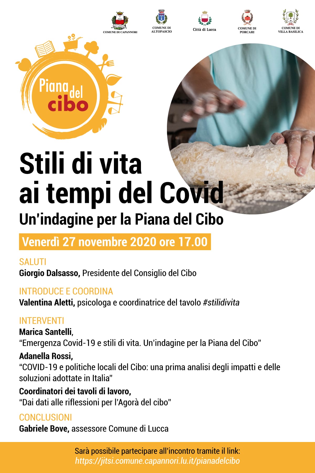 Maggiore consumo di prodotti fatti in casa e locali, supporto all’accesso al cibo per le fasce vulnerabili, riduzione degli sprechi. La pandemia ha davvero cambiato il nostro stile di vita quando si tratta di cibo? Ci aiutano a scoprirlo la Piana del cibo, progetto di gestione coordinata e partecipata delle politiche del cibo a cui partecipano i Comuni di Lucca, Capannori, Altopascio, Porcari e Villa Basilica, e i risultati della ricerca effettuata nei mesi scorsi da Marica Santelli, laureata in scienze della nutrizione umana all’Università di Pisa. L’appuntamento è per venerdì 27 novembre alle 17, con una la conferenza “virtuale” aperta al pubblico promossa dal Consiglio della Piana del cibo, durante la quale saranno illustrati, analizzati e discussi i risultati del lavoro portato a termine da Santelli, “Stili di vita ai tempi del Covid. Un’indagine per la Piana del cibo”.