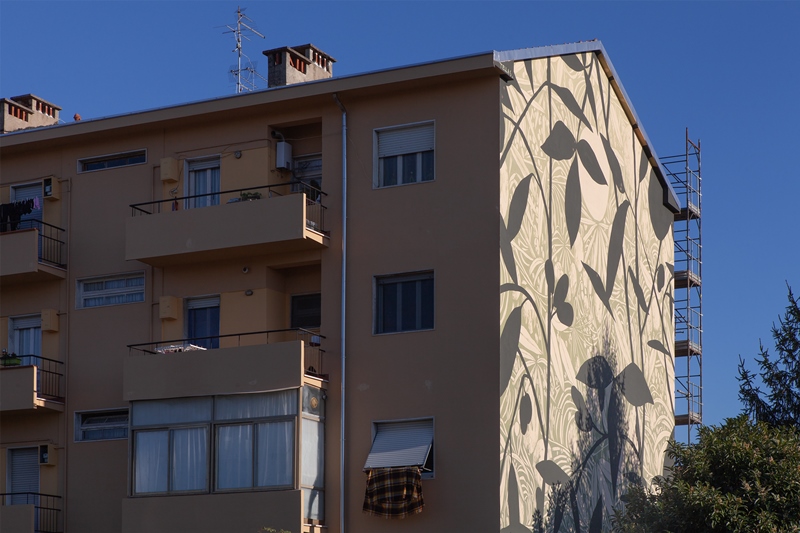 Lo street artist Fabio Schirru, in arte Tellas ha completato la sua opera in via Bertoloni, dove ha realizzato un murale di 160 mq sulla parete di un immobile di edilizia residenziale pubblica gestito da ERP Massa-Carrara. «L’opera d’arte pubblica di via Bertoloni - spiega l’artista Tellas - fa parte di una nuova serie a cui sto lavorando chiamata "Mimesi" e cominciata a Ragusa con il progetto "Bitume" . Ora sto cercando di rendere ancora più dettagliata questa ricerca che mira a rendere più minuziosi i colori che si ispirano alle aree verdi che stanno attorno agli edifici e alle pareti che vado a dipingere». E nel caso della parete dell’immobile di via Bertoloni, ad essere richiamata è la pianta acquatica Cyperus, un finto papiro che si trova all’interno del giardino condominiale dell’alloggio popolare di via Bertoloni.