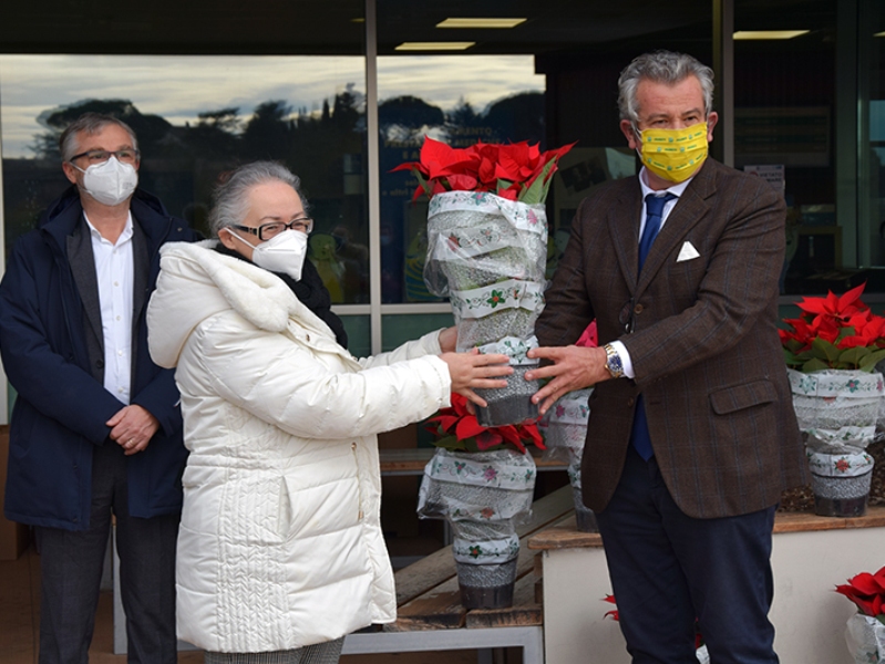 100 stelle di Natale per i professionisti dell’Azienda ospedaliero-universitaria Senese impegnati nell’area Covid. È la donazione di Coldiretti Siena destinata agli operatori del policlinico Santa Maria alle Scotte: un bel gesto di generosità, ripetuto in tutti gli ospedali della Toscana in vista delle festività, per testimoniare la vicinanza di questo ente a chi sta operando in prima linea per fronteggiare il Covid-19. Presenti alla consegna anche l’assessore regionale alla Sanità Simone Bezzini e il Rettore dell’Università degli Studi di Siena Francesco Frati, accolti dal direttore generale ff dell’Aou Senese Maria Silvia Mancini e dal direttore sanitario Roberto Gusinu.
