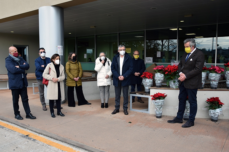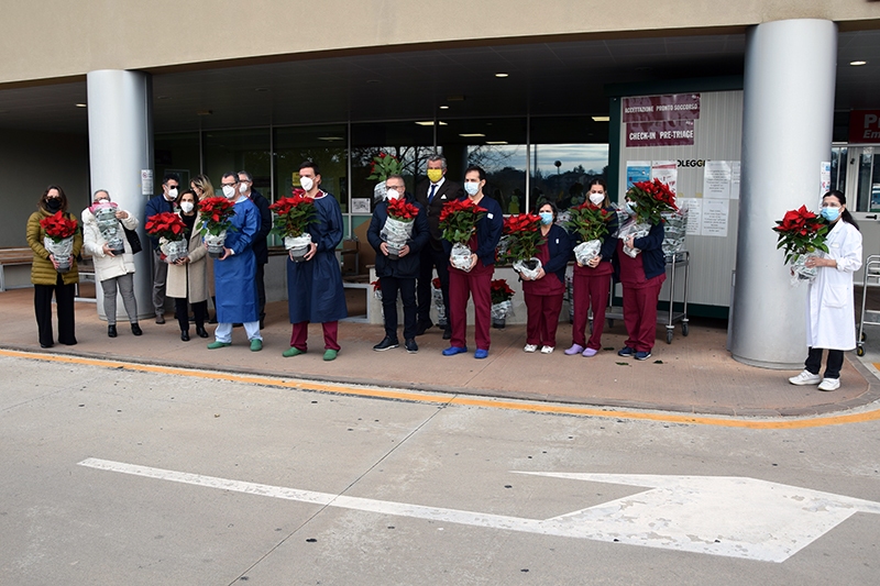 100 stelle di Natale per i professionisti dell’Azienda ospedaliero-universitaria Senese impegnati nell’area Covid. È la donazione di Coldiretti Siena destinata agli operatori del policlinico Santa Maria alle Scotte: un bel gesto di generosità, ripetuto in tutti gli ospedali della Toscana in vista delle festività, per testimoniare la vicinanza di questo ente a chi sta operando in prima linea per fronteggiare il Covid-19. Presenti alla consegna anche l’assessore regionale alla Sanità Simone Bezzini e il Rettore dell’Università degli Studi di Siena Francesco Frati, accolti dal direttore generale ff dell’Aou Senese Maria Silvia Mancini e dal direttore sanitario Roberto Gusinu.
