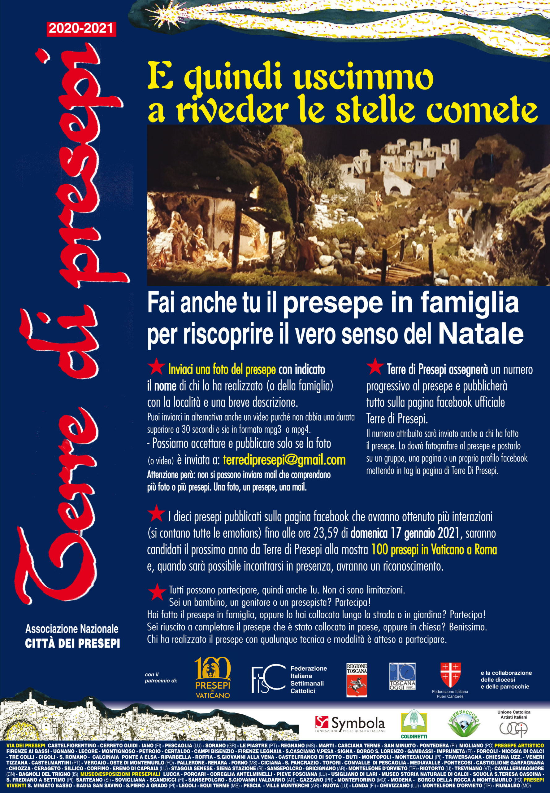 All'invito si affianca la proposta pratica che ha come slogan "E quindi uscimmo a riveder le stelle comete". Chi invia la foto del proprio presepe a terredipresepi@gmail.com, attraverso la pagina facebook di Terre di Presepi si partecipa a un contest nazionale e coloro che riscuoteranno più emozionalità saranno candidati per il prossimo Natale alla selezione per la mostra dei 100 presepi in Vaticano. Terre di Presepi è la rete delle natività più lunga d'Italia e prima dell'arrivo della pandemia muoveva più di un milione di persone a vedere i presepi. Saranno pochi quest'anno i presepi aperti e visitabili nei paesi e nelle chiese; tuttavia per essi è stato predisposto un regolamento per gestire in termini di sicurezza sanitaria le visite che ci saranno.
