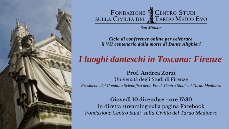 Il Centro Studi sulla Civiltà del Tardo Medio Evo continua nella sua opera di divulgazione dei risultati più aggiornati della Ricerca storica, inserendosi a pieno titolo nelle iniziative legate alle celebrazioni del VII centenario dalla morte di Dante Alighieri, indette dal Ministero della cultura, con un ciclo di ben cinque Conferenze sul tema “ I luoghi danteschi in Toscana”. Queste prenderanno avvio il 10 Dicembre prossimo sulla pagina facebook della Fondazione.