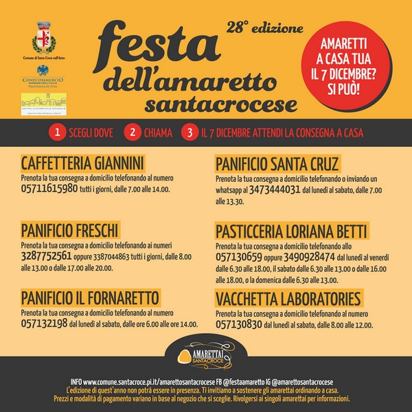 Dal 1° dicembre è iniziata la pubblicazione delle videoricette sul canale facebook dell'Amaretto Santacrocese (https://www.facebook.com/festaamaretto) e sul canale Youtube del Comune di Santa Croce sull'Arno (https://www.youtube.com/channel/UCXAf0LQnYcvl7xaKg-sgXAQ/).