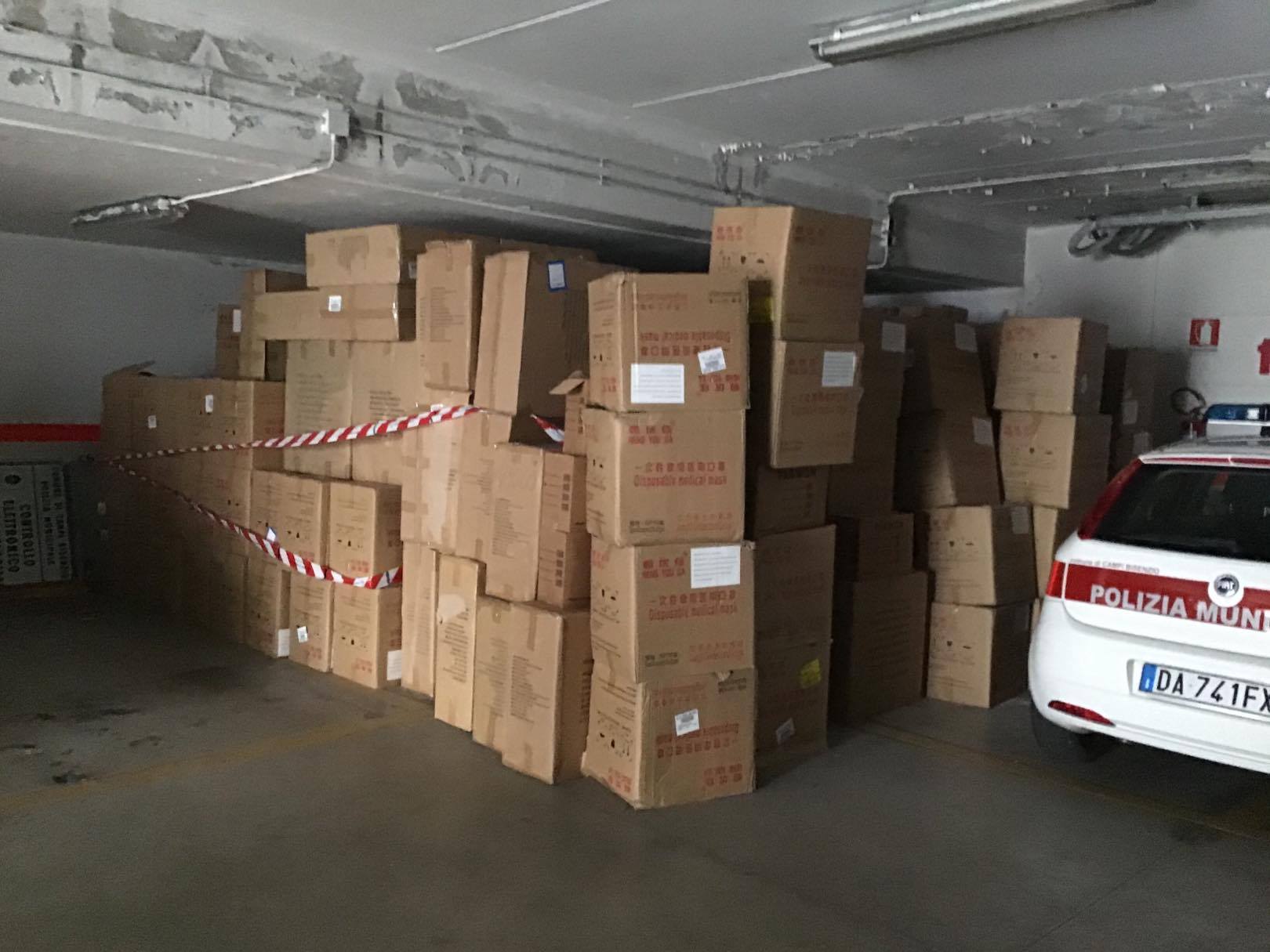 Decine e decine di scatole con materiale sanitario, presumibilmente mascherine di protezione, sono stipate da settimane all’interno del garage della polizia municipale sotto Piazza Dante.
