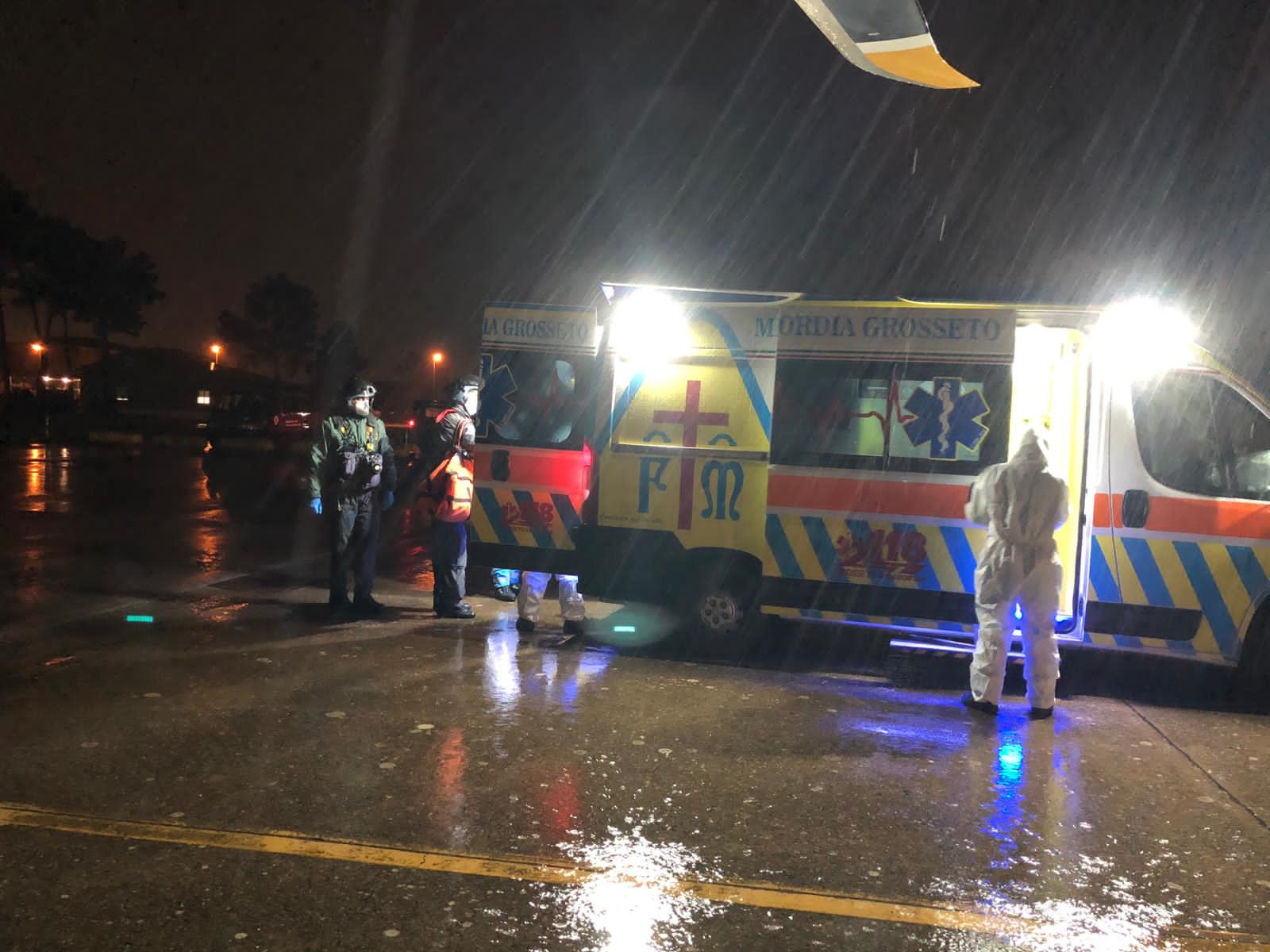 Il malcapitato è stato trasportato presso la base dell’Aeronautica di Grosseto dove è arrivato alle 22.00 e successivamente trasportato presso l'ospedale di Grosseto.