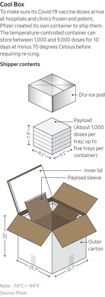 I vaccini anti Covid della Pfizer/BioNTech arriveranno in scatole quadrate da 22,9 centimetri per lato immerse nel ghiaccio secco: all'interno saranno accolti fino a 4.875 dosi in fiale allineate lungo cinque strati sovrapposti - su ogni strato ci sono 195 fiale e da ogni fiala si possono ricavare cinque dosi e, quando si inizia il processo per diluirle, poi devono essere somministrate entro cinque 5-6 ore. In Italia i vaccini arriveranno direttamente dallo stabilimento belga della multinazionale PfizerBioNTech, trasportati all'interno di contenitori che possono durare fino a 25 giorni, purché adeguatamente refrigerati grazie al riempimento con ghiaccio secco ogni 5 giorni.