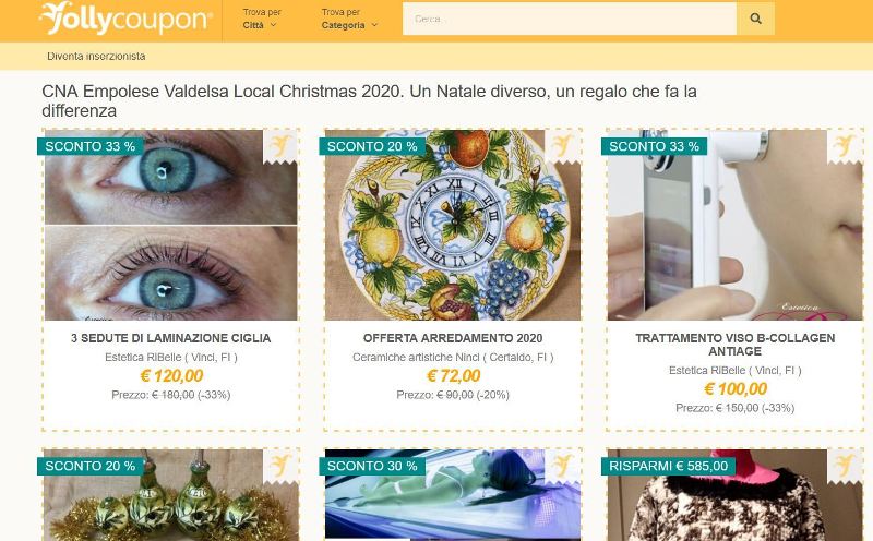 Le categorie merceologiche attualmente presenti (ma la piattaforma è in costante aggiornamento) sono varie, dai prodotti ai servizi: cesti natalizi con le specialità locali, borse, massaggi e trattamenti estetici, taglio e colore dal parrucchiere, abiti, maglieria, cene, food, visite esperienziali, artigianato artistico. Tutto suddiviso tra le aree della Città Metropolitana: lo shop dell’Empolese Valdelsa, di Firenze e Fiesole, del Mugello, del Chianti, del Valdarno-Valdisieve, della Piana Fiorentina, di Scandicci-Lastra a Signa.