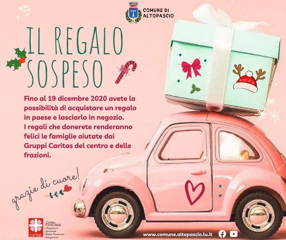 Giochi, libri, album e pennarelli, vestiti, braccialetti, profumi, fiori o, perché no, una pizza, una colazione, un panettone o, ancora, un servizio dal parrucchiere, un pranzo al ristorante o un prodotto di farmacia per i bambini o per la cura della persona. Tutto può diventare un “Regalo Sospeso", l'iniziativa per fare un regalo di Natale ai bambini e alle famiglie che hanno più bisogno, in questo momento di difficoltà. A dare vita al progetto è il Comune di Altopascio, in collaborazione con i gruppi Caritas del centro e delle frazioni (Altopascio, Spianate, Marginone e Badia Pozzeveri).