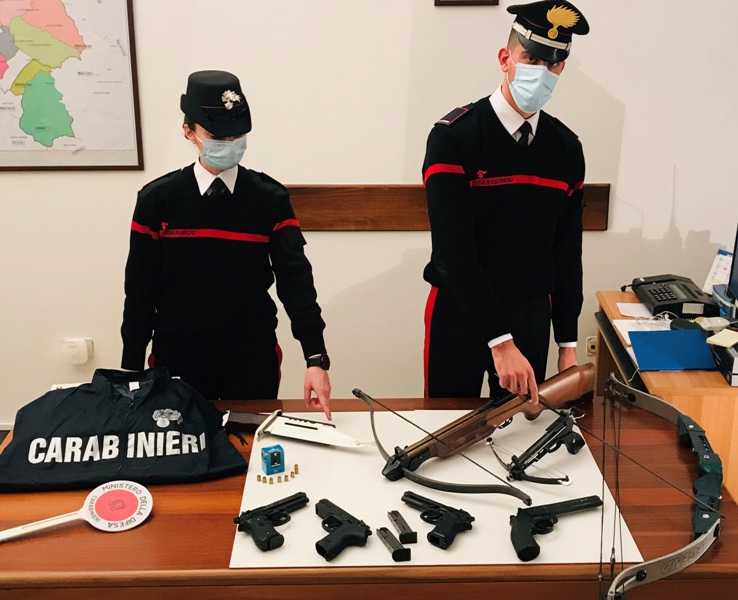 Nella mattinata, i militari della Stazione di San Giovanni Valdarno sono quindi intervenuti, all’unisono, presso i due domicili nella disponibilità dell’uomo, a Terranuova Bracciolini e a Firenze. All’esito delle perquisizioni locali, gli uomini dell’Arma hanno rinvenuto e sottoposto a sequestro un pugnale lungo 46 cm, non denunciato; 4 repliche di pistola, tra cui un revolver, a gas, prive dell’obbligatorio tappo rosso; un arco; due balestre; delle frecce e delle cartucce a salve. Il tutto è stato immediatamente sequestrato, e l’uomo è stato deferito in stato di libertà, oltre che per minaccia grave, per detenzione abusiva di armi.