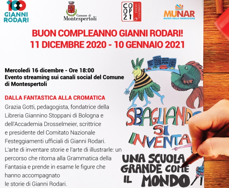 Mercoledì 16 dicembre si svolgerà online il primo evento in streaming, dal titolo "Dalla Fantastica alla Cromatica" a cura di Grazia Gotti, pedagogista, fondatrice della Libreria Giannino Stoppani di Bologna e dell'Accademia Drosselmeier, scrittrice e presidente del Comitato Nazionale Festeggiamenti ufficiali di Gianni Rodari.