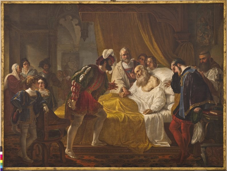 3. Cesare Mussini, Leonardo da Vinci, vecchio e mortalmente infermo, spira tra le braccia di Francesco I, 1828