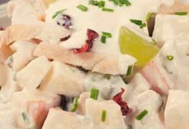 Insalata di tacchino con uva rossa, pera e salsa al gorgonzola
