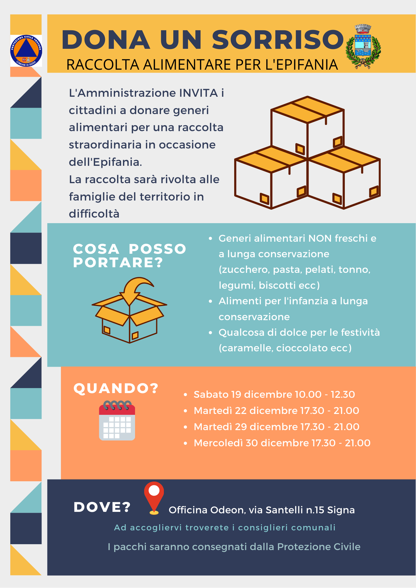Al via l’iniziativa DONA UN SORRISO, una raccolta straordinaria di generi alimentari a cura dell’Amministrazione Comunale di Signa come segno di aiuto alle famiglie in difficoltà del territorio comunale.