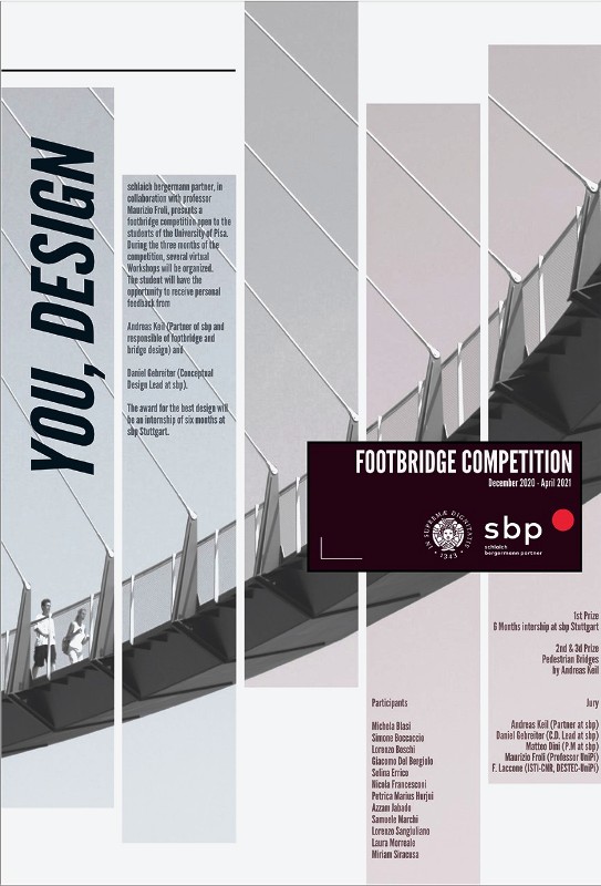 Grazie alla presenza del professor Maurizio Froli, inventore delle travi di vetro TVT e secondo classificato nel concorso World Innovation in Bridge Engineering 2017, lo studio SBP ha proposto la competizione “You, design” riservata agli studenti del corso pisano che ha come tema il progetto di una passerella pedonale nei pressi di Stoccarda, sede principale di SBP. Gli studenti riceveranno istruzione e guida alla progettazione di passerelle nel corso di alcuni workshop on line che saranno tenuti da alcuni dei progettisti dello Studio SBP, tra i quali Andreas Keil, direttore della Bridge Division, Daniel Gebreiter, Conceptual Design Lead e Matteo Dini, Project Manager e già allievo dell’Università di Pisa.