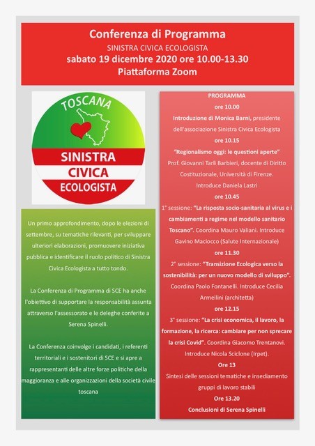 Il prossimo sabato 19 dicembre ci sarà, naturalmente via web, la Conferenza di Programma per la Toscana di Sinistra Civica Ecologista (SCE). Discuteremo e faremo proposte sui temi socio sanitari, sulIe questioni della transizione ecologica, lavoro e istruzione. E su questi stessi temi siamo impegnati anche a livello locale.