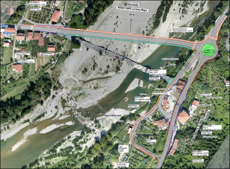 Il nuovo ponte sul fiume Magra, a monte di quello attuale, avrà un tracciato pressoché rettilineo. Composto da quattro campate con luci di circa 54 m + 90 m + 90 m + 54 m per una lunghezza complessiva di circa 288 m, ospiterà una carreggiata stradale costituita da due corsie di larghezza pari a 3.50 m, completate da banchine di larghezza pari a 1.25 m, oltre a due piste ciclopedonali poste su entrambi i lati, per una larghezza totale di 16.90 m. Le pile e le spalle saranno realizzate in calcestruzzo armato su fondazioni profonde anch’esse in cemento armato. L’impalcato sarà realizzato in struttura mista acciaio-calcestruzzo costituito da travi in acciaio ad altezza variabile con sovrastante soletta in cemento armato.