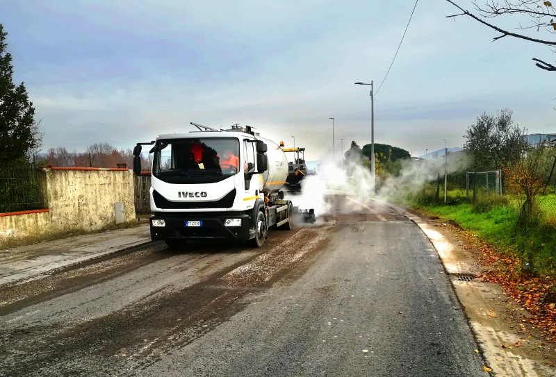 L’intervento, che ha interessato oltre mezzo chilometro di strada, non si è limitato alla stesura dello strato superficiale di asfalto, ma ha previsto anche la scarificazione totale del vecchio manto e la ristesura di uno strato di pavimentazione stradale (binder + tappeto) di 15 cm di spessore e, nei punti maggiormente usurati, anche il rifacimento della fondazione stradale.