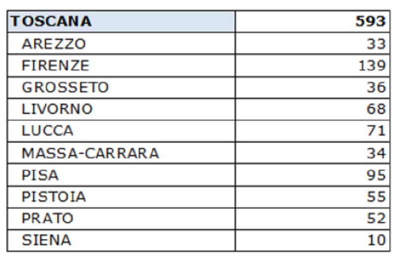 A livello provinciale, il maggior numero di frodi creditizie è stato registrato nella provincia di Firenze, con 139 casi, che precede Pisa, con 95 casi, Lucca, con 71, e Livorno, con 68.