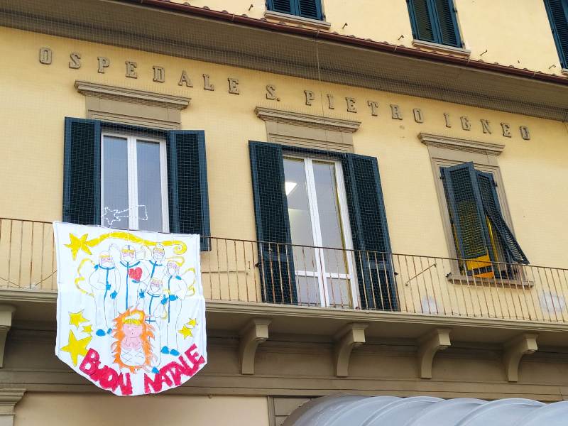 Nei giorni scorsi alcuni medici ed infermieri dell’Ospedale San Pietro Igneo di Fucecchio hanno appeso un telo, sopra la facciata di ingresso, con scritto “Buon Natale” creato appositamente dallo stesso personale sanitario con un disegno particolare: alcuni operatori vestiti con tute e dispositivi di protezione intorno a Gesu’ Bambino. Un modo diverso per fare gli auguri a tutta la cittadinanza che quest’anno si trova a vivere una festività diversa a causa dell’emergenza sanitaria, ma anche l’occasione per ringraziarla della loro vicinanza in questi mesi.