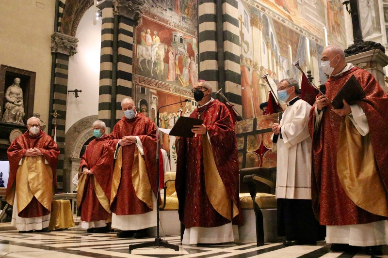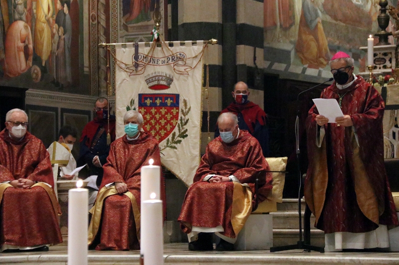 La messa è stata concelebrata da cinquanta sacerdoti della diocesi di Prato alla presenza di 150 persone, il massimo consentito per la cattedrale dalle norme anti contagio. Nelle prime file erano sedute le autorità: c’era il presidente della Regione Eugenio Giani, accanto a lui il sindaco Matteo Biffoni, il sindaco di Vaiano Primo Bosi e i membri delle giunte dei Comuni di Vernio e Cantagallo. C’erano l’onorevole Erica Mazzetti, la consigliera regionale Ilaria Bugetti e rappresentanti delle forze dell’ordine. Il pontificale è stato trasmesso in diretta televisiva su Tv Prato.