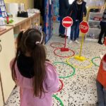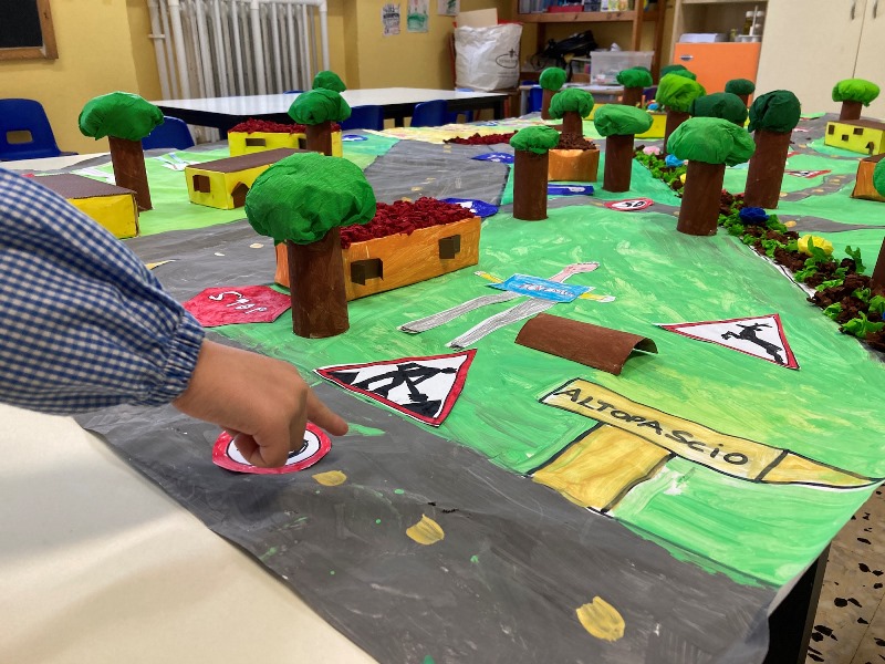 E grazie alle insegnanti, le regole sono introdotte ai bambini attraverso il gioco: gincane tra cerchi colorati e cartelli segnaletici, puzzle con vigili e semaforo, mappe del paese fatte con cartoncino e colla vinilica.