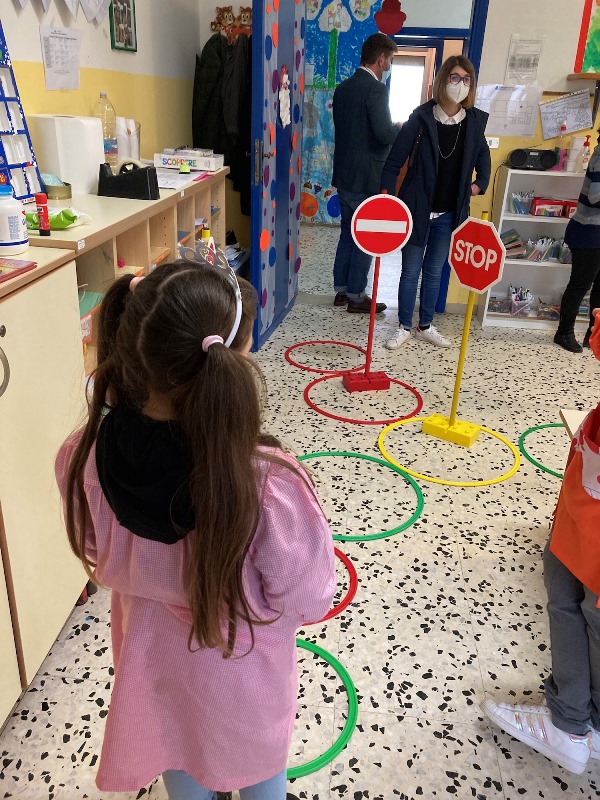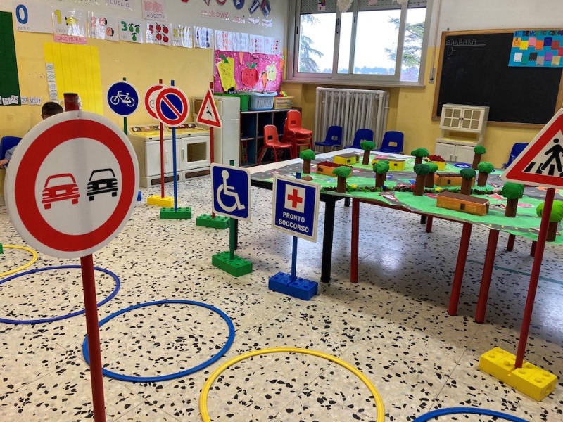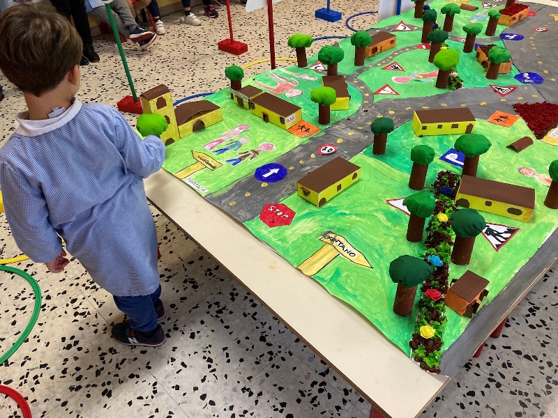 E grazie alle insegnanti, le regole sono introdotte ai bambini attraverso il gioco: gincane tra cerchi colorati e cartelli segnaletici, puzzle con vigili e semaforo, mappe del paese fatte con cartoncino e colla vinilica.