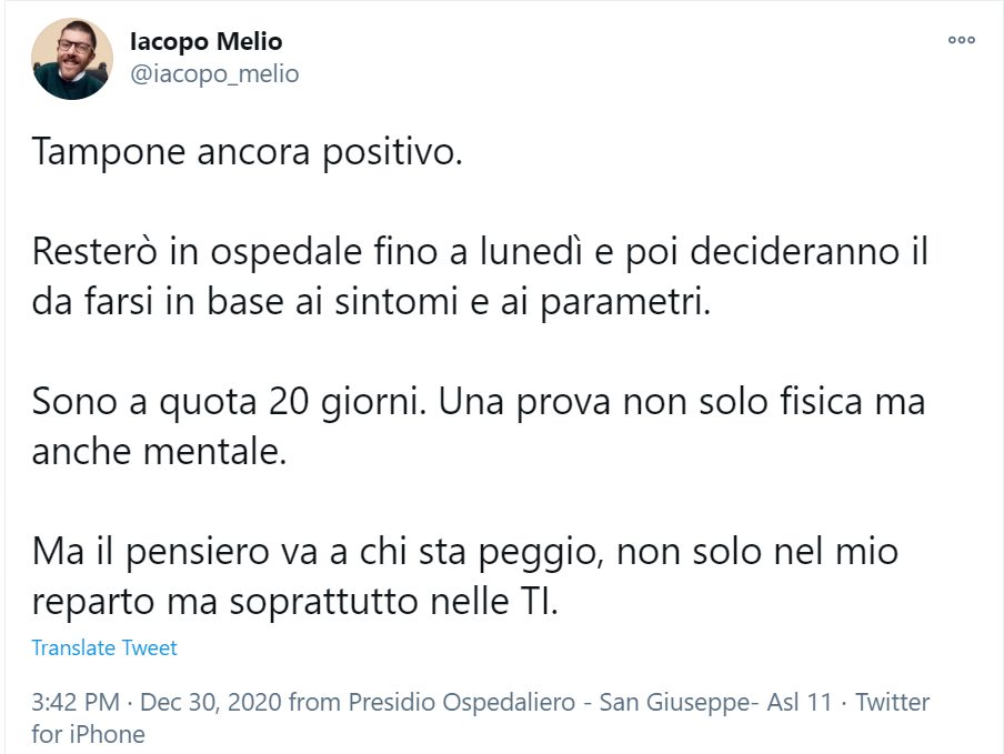 Nel pomeriggio annuncia che resterà in ospedale fino a lunedì: "Tampone ancora positivo. Resterò in ospedale fino a lunedì e poi decideranno il da farsi in base ai sintomi e ai parametri. Sono a quota 20 giorni. Una prova non solo fisica ma anche mentale. Ma il pensiero va a chi sta peggio, non solo nel mio reparto ma soprattutto nelle TI".