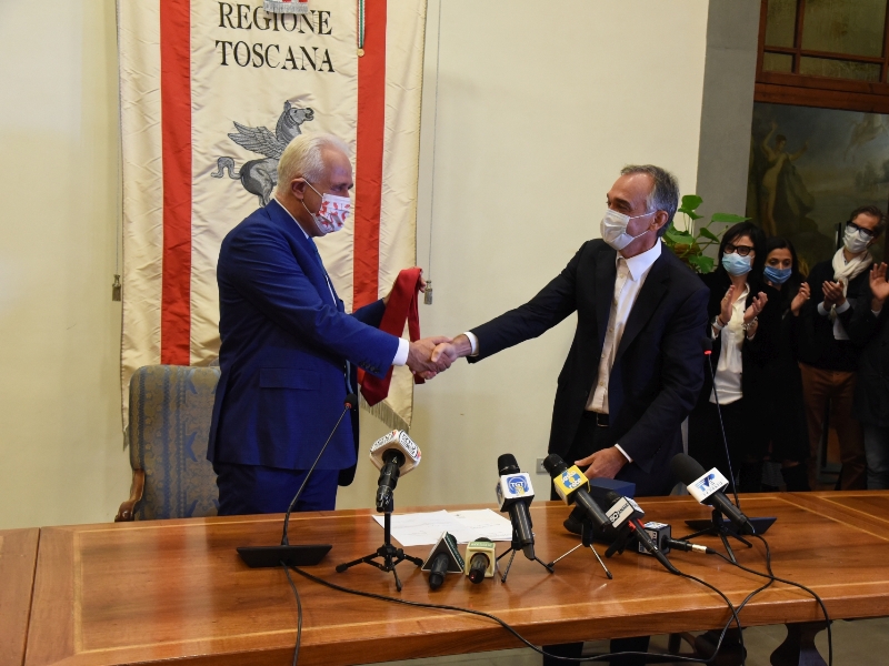 Eugenio Giani è il nuovo governatore della Toscana. Il predecessore Enrico Rossi gli consegna una cravatta in dono