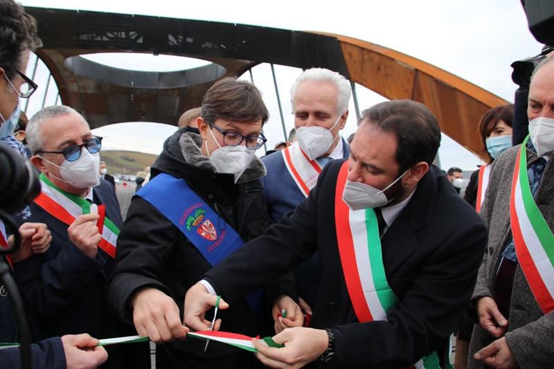 Dopo il taglio del nastro del nuovo tratto della 429, i sindaci si portano a casa un pezzo del nastro inaugurale. (foto gonews.it)