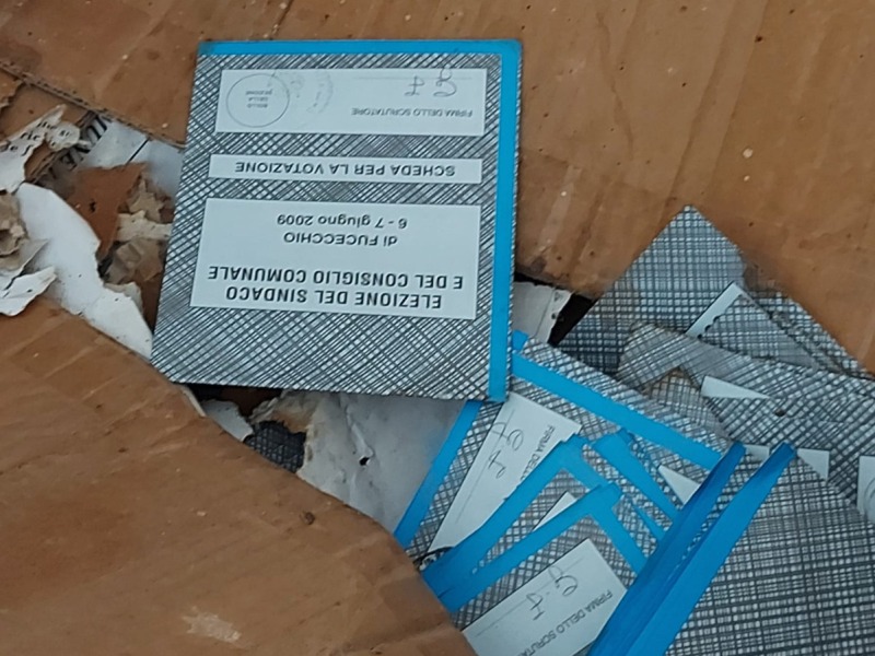 Lo stupore quando da una porta aperta del piano terra ho potuto scorgere un “monte” una vera e propria “discarica” di materiale elettorale, schede, registri ecc. vidimati e completamente abbandonati alla mercè di chicchessia (tra le schede figurano alcune relative alle elezioni comunali di Fucecchio nel 2009 ma anche per il referendum del 2011, NdR).