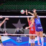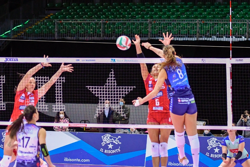 Anche nel terzo set Firenze impone subito il suo ritmo (3-0), poi Lanier suona la carica per la Zanetti (5-5), e un errore in attacco di Guerra vale il primo vantaggio del match (7-8), con Enright che poi trova l’attacco del + 2 (8-10): per la prima volta le ospiti riescono a tenere il cambio palla con continuità (13-15), poi Il Bisonte trova aiuto dal muro difesa e impatta (15-15), tenendo anch’esso duro sul cambio palla (19-19). La squadra di Mencarelli torna avanti con l’attacco out di Lanier (20-19), poi è l’errore di Loda a favorire il + 2 (22-20), con coach Turino che deve fermare il gioco: Nwakalor conferma il gap con la pipe (23-21), Turino spende il secondo time out e Mencarelli mette in battuta Hashimoto per Alberti, ma Lanier trasforma dopo due grandi difese delle compagne e poi Loda impatta (23-23), tanto che stavolta è Mencarelli a dover parlarci su. Al rientro Loda mura Nwakalor e Mencarelli usa subito il suo secondo time out: Guerra annulla il set point (24-24), Loda ne procura un altro (24-25) e qui è l’errore di Nwakalor a riaprire la partita (24-26).