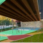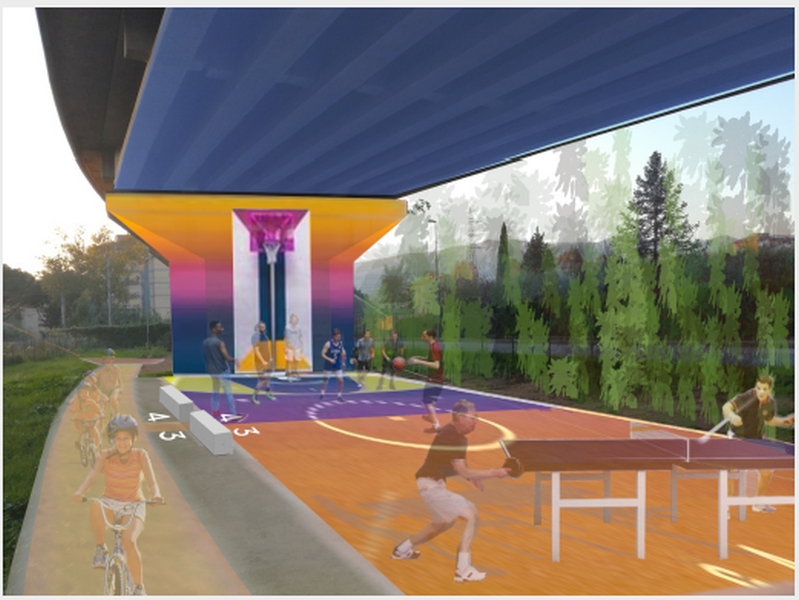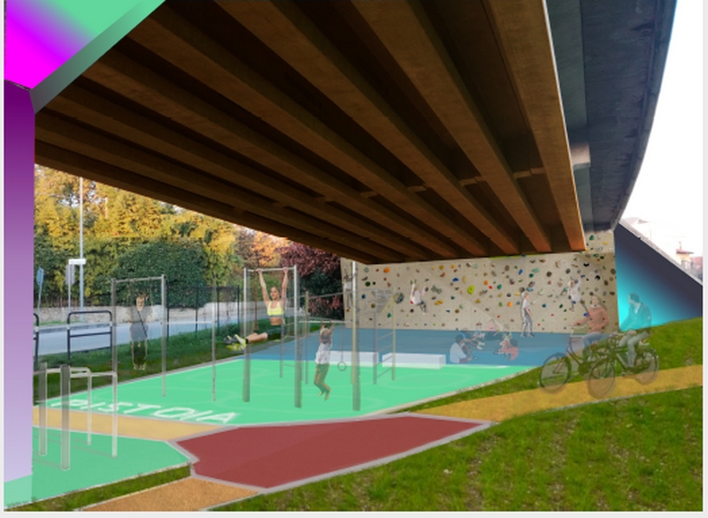 In quello che sarà chiamato il “Giardino degli studenti”, posto nello spazio sottostante le campate del ponte, è prevista l'installazione di attrezzature ludico-sportive: parete per arrampicata, attrezzi per la callistenia, superfici per il calcetto e il basket e tavoli da ping-pong. La nuova area ricreativa è pensata per una fascia di età adolescenziale e questa soluzione consente di valorizzare uno spazio altrimenti inutilizzato e degradato e vuole essere un invito a vivere il nuovo parco. Sfruttando il ritmo dei piloni del ponte, l’area verrà suddivisa in quadranti dedicate alle diverse discipline; tutto al coperto e al di fuori dei rumori e del traffico.