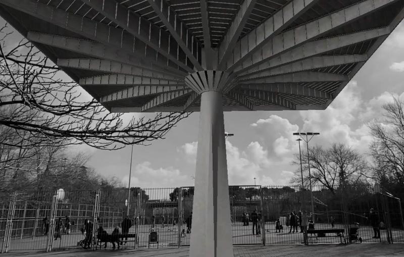Lucia Tahan ha registrato il video in un quartiere periferico di Madrid costruito negli anni ’60, tra palazzi moderni e case popolari. Inserendo l’effetto di realtà aumentata che riproduce la struttura modulare iconica del Palazzo del Lavoro, la designer mostra il contrasto tra l’eclettica banalità dell’area e la sua geometria.