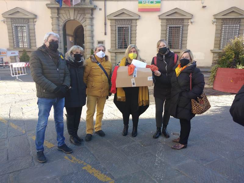 Flash mob dei Commercianti Uniti Firenze che stamani, 18 gennaio, hanno consegnato alla Regione la scatola di indumenti rossi e arancioni portati nei negozi dai clienti, che hanno così usufruito di un ulteriore 10% di sconto sulla merce. Assente il governatore Eugenio Giani, i rappresentanti dei commercianti, balzati alle cronache con la bandiera di 'Esistiamo', sono stati ricevuti dal capo di gabinetto, al quale hanno consegnato un documento con le loro richieste. Insieme alla portavoce Coppoli, che è anche presidente del centro commerciale naturale di Borgo La Croce, erano presenti Stefano Decina, presidente del centro commerciale naturale Dalmazia, Sarah Furlan, presidente del centro commerciale naturale Le Cure, Barbara Zannoni, vice presidente Ccn Porta Romana.