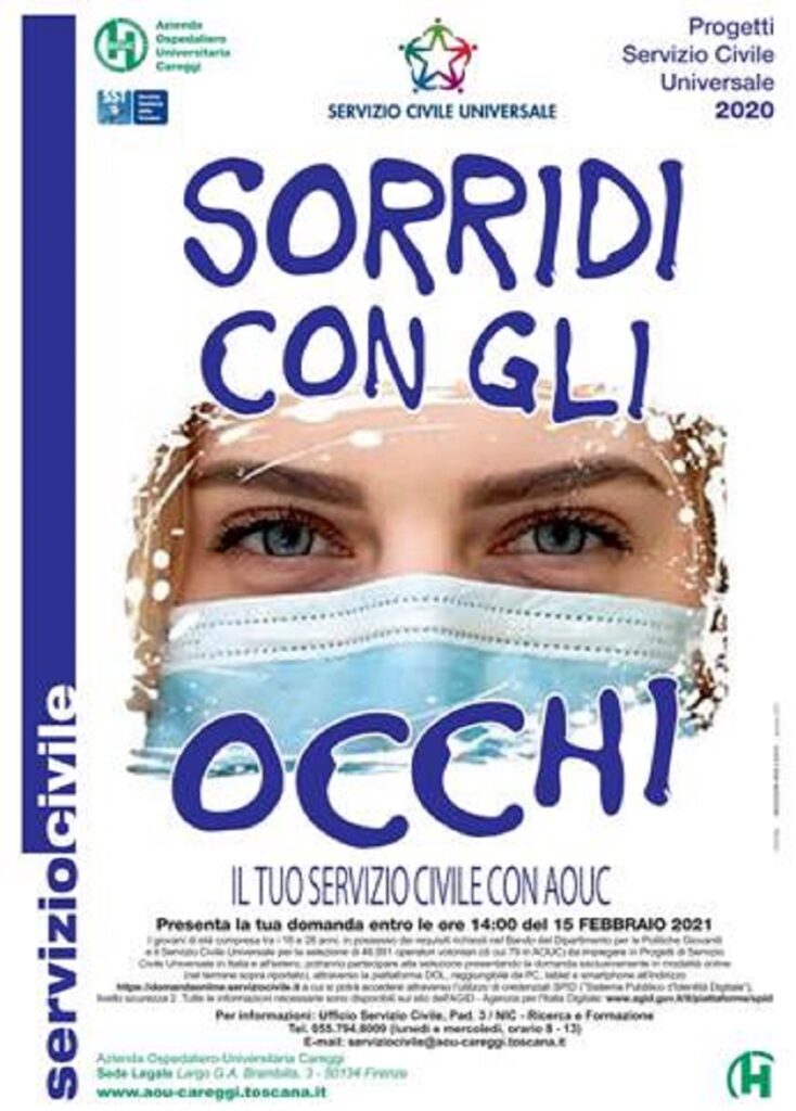 Scade il 15 febbraio 2021 il termine di presentazione della domanda di partecipazione alle selezioni per il Servizio Civile Universale. A Careggi sono disponibili 79 posti in 5 progetti: per il supporto alla relazione con gli utenti, facilitare l’accesso dei cittadini alle prestazioni sanitarie, la programmazione chirurgica, le attività a sostengo al percorso oncologico, le attività sociali e riabilitative nell’ambito dell’Unità Spinale Unipolare. La domanda di partecipazione può essere presentata solo in modalità online all’indirizzo https://domandaonline.serviziocivile.it , info su www.aou-careggi.toscana.it