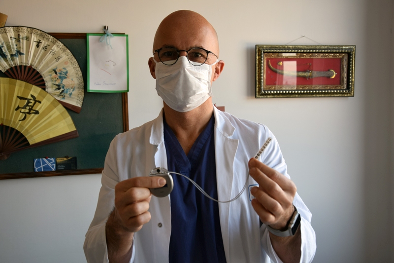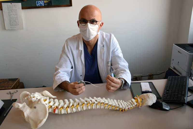«L'intervento chirurgico prevede l'impianto di una piastrina in silicone con 16 contatti elettrici nel canale spinale dorsale per andare a stimolare il midollo», spiega il neurochirurgo Francesco Cacciola, supportato nell’intervento dall’anestesista Angela Gori e della strumentista Vanessa Pucci. «Gli impulsi per la stimolazione derivano da una batteria ricaricabile che viene impiantata sotto la cute come nei pacemaker cardiaci – aggiunge il dottor Cacciola -. La differenza è che mentre il pacemaker va a stimolare elettricamente il cuore, il neuro-stimolatore va a stimolare delle strutture nervose, al livello cerebrale o spinale».