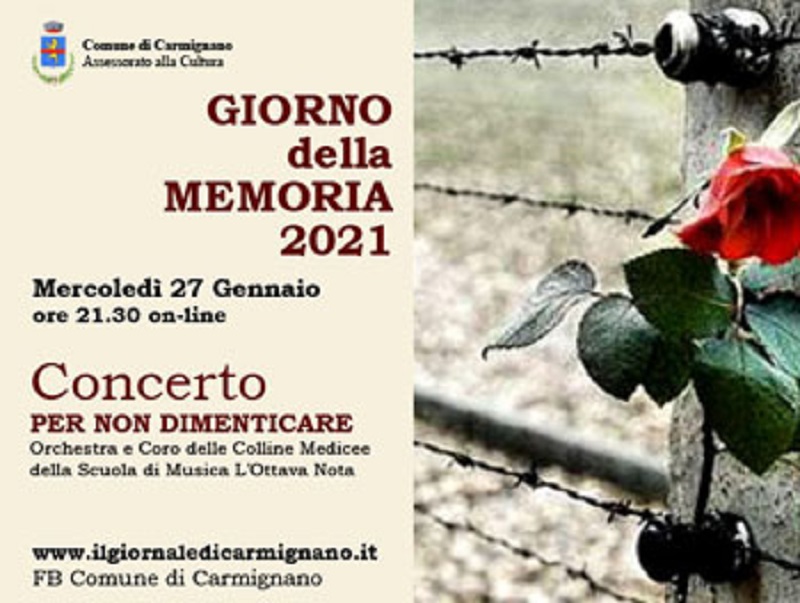 Per non dimenticare uno dei periodi più oscuri della storia del nostro Paese e dell'Europa e così drammatico per l'umanità, l'Assessorato alla Cultura del Comune di Carmignano organizza il concerto "Per non dimenticare" che, stante l'emergenza sanitaria e nel rispetto delle misure cautelative dei DPCM governativi, verrà registrato nei saloni della Villa Medicea di Artimino e reso fruibile a tutti sul sito www.ilgiornaledicarmignano.it e sui canali social istituzionali alle ore